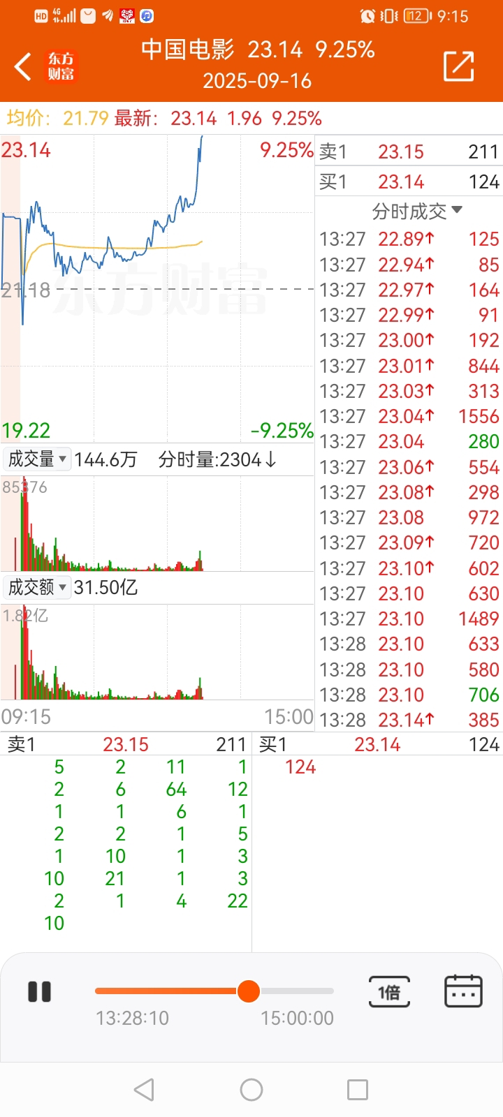 2025.9.16中国电影盘中最高涨到23.14元每股,就算明天开始连续涨停板,