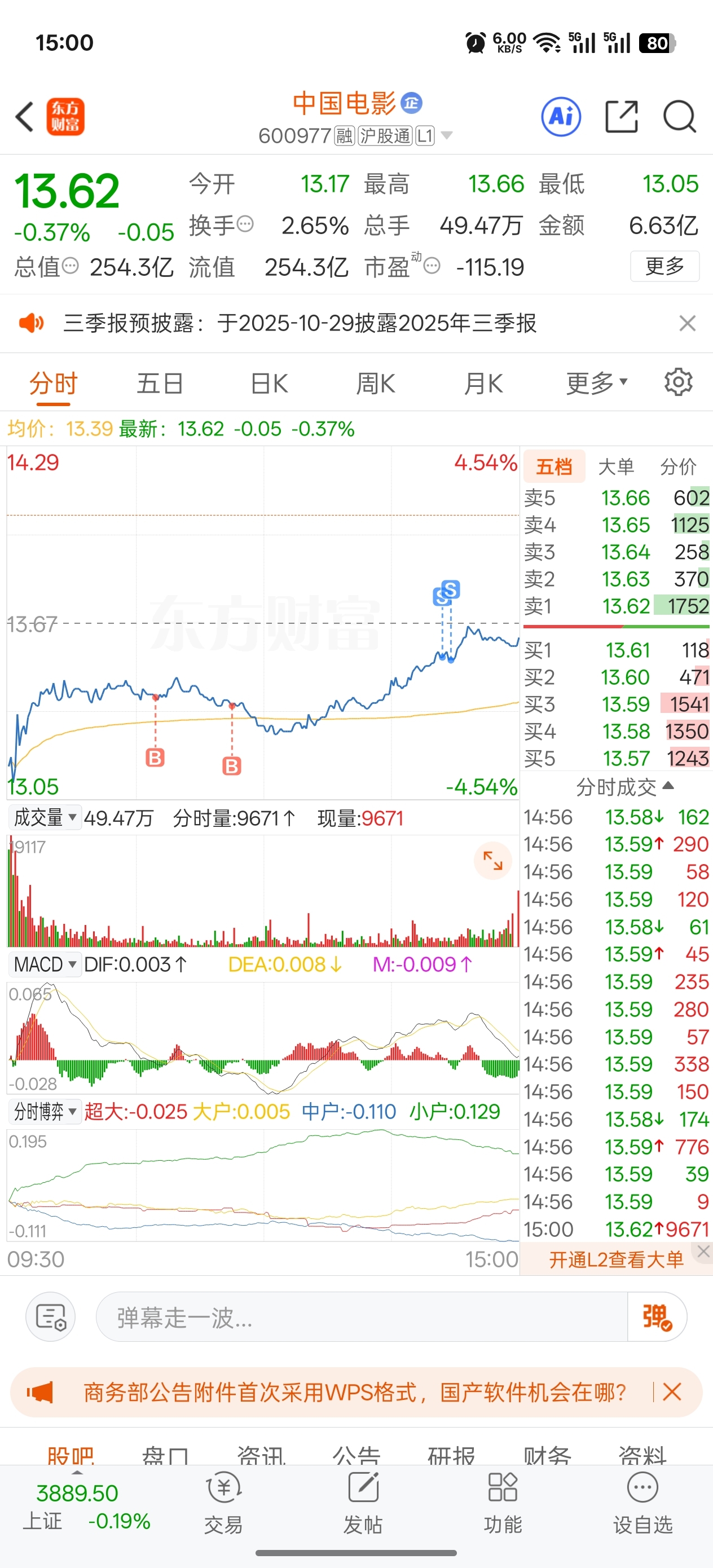 $中国电影(SH600977)$ 今天买的50%回收回来。明天跌又加,涨就回本