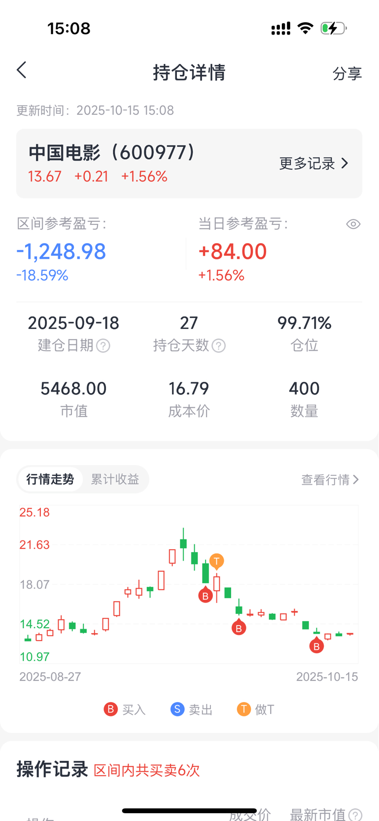 $中国电影(SH600977)$ 兄弟们还差多少点回本,我只差18个点了