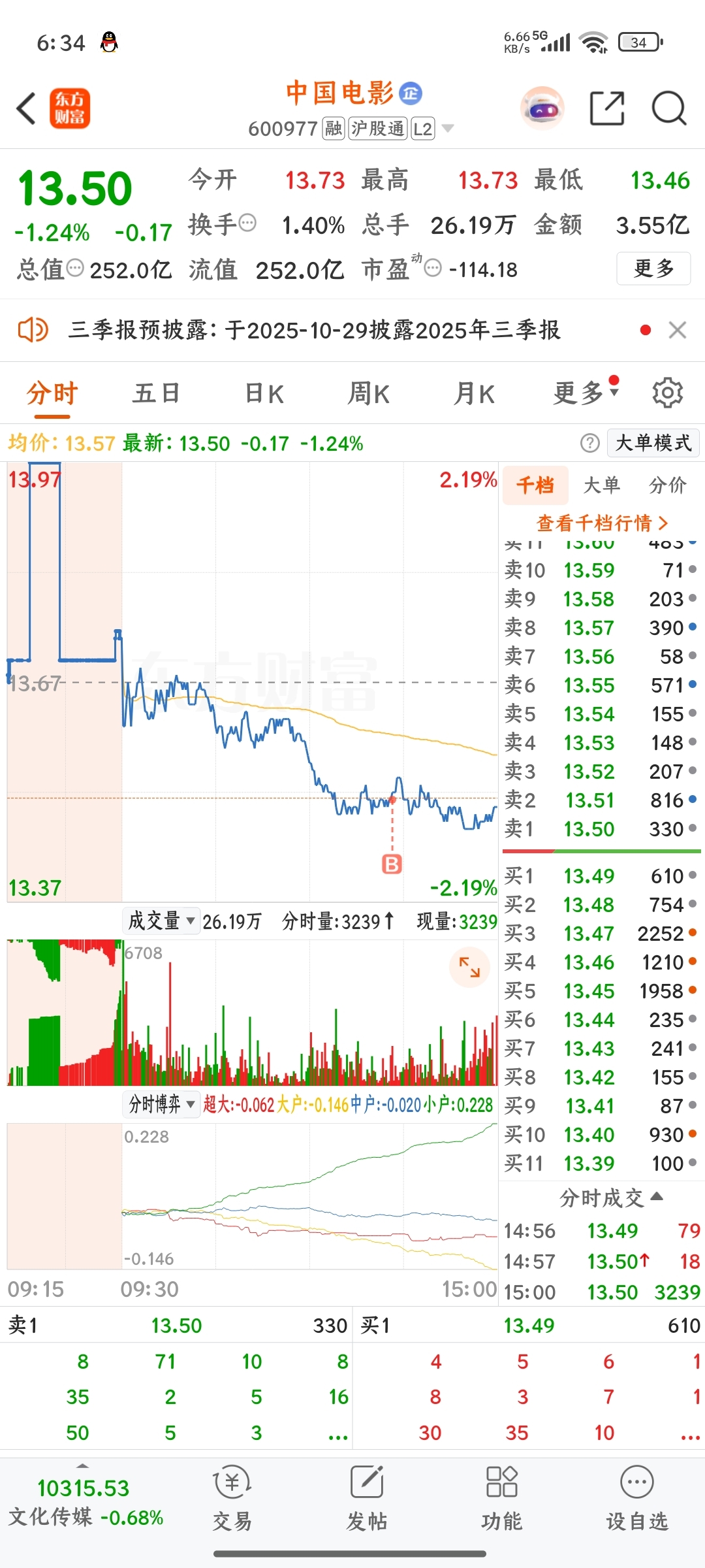 $中国电影(SH600977)$ 能不能吃三天反弹,10个点就行了