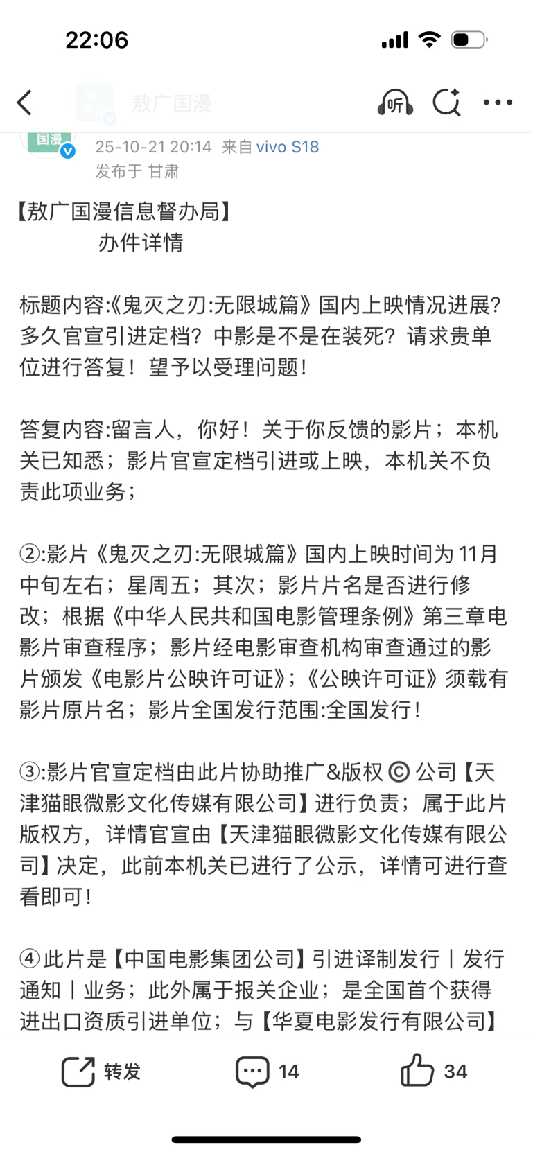 $中国电影(SH600977)$ 2025年 全球票房 第五名的 《鬼灭之刃》 确认在 11月中旬周五 (11月14上映)中影引进发行....