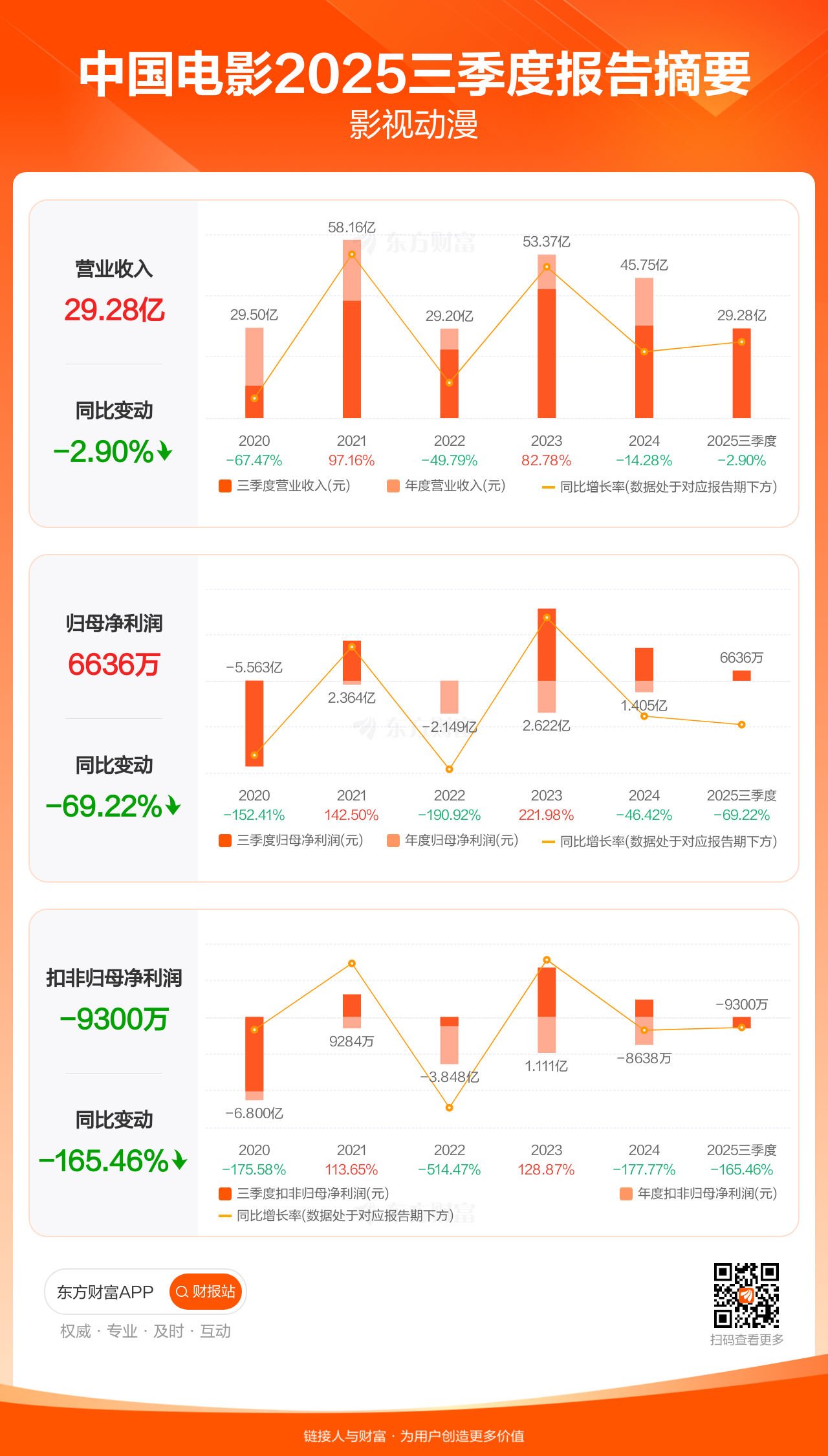 中国电影10月29日发布2025年三季报显示,公司前三季实现营业收入29.28亿元,同比下滑2.90%;归母净利润6635.70万元,同比下滑69.22%;扣非归母净利润-9300.22万元。