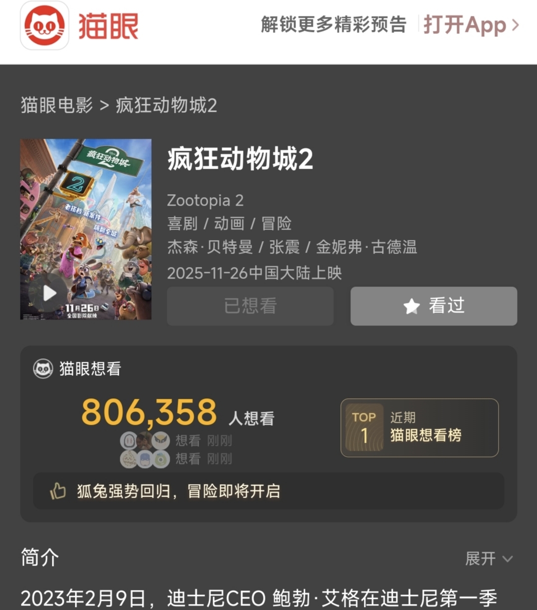 $中国电影(SH600977)$ 主力看没疯狂动物城2突破80万了,大家继续点击呀