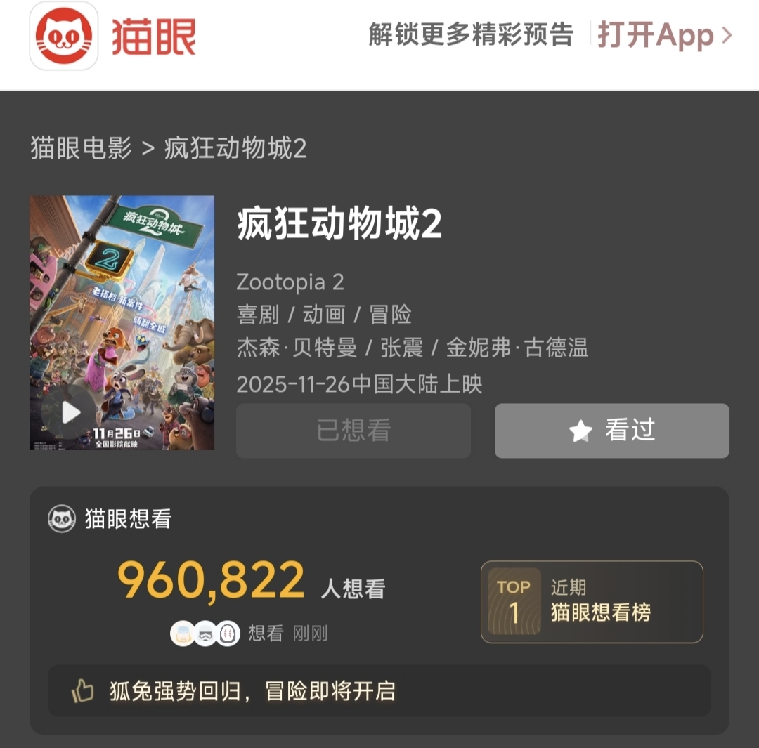 $中国电影(SH600977)$ 主力猫眼人数快一百万了,大家继续加油点击呀
