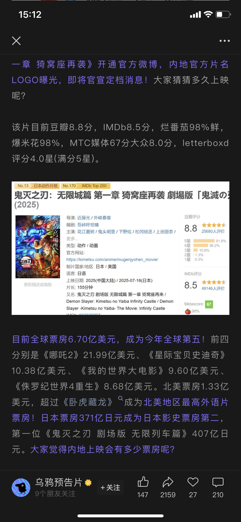 $中国电影(SH600977)$ 这利好是真的重磅了,中国电影压了这么久,就是想打爆第四季度业绩吧。全球票房50亿,国内保守18亿