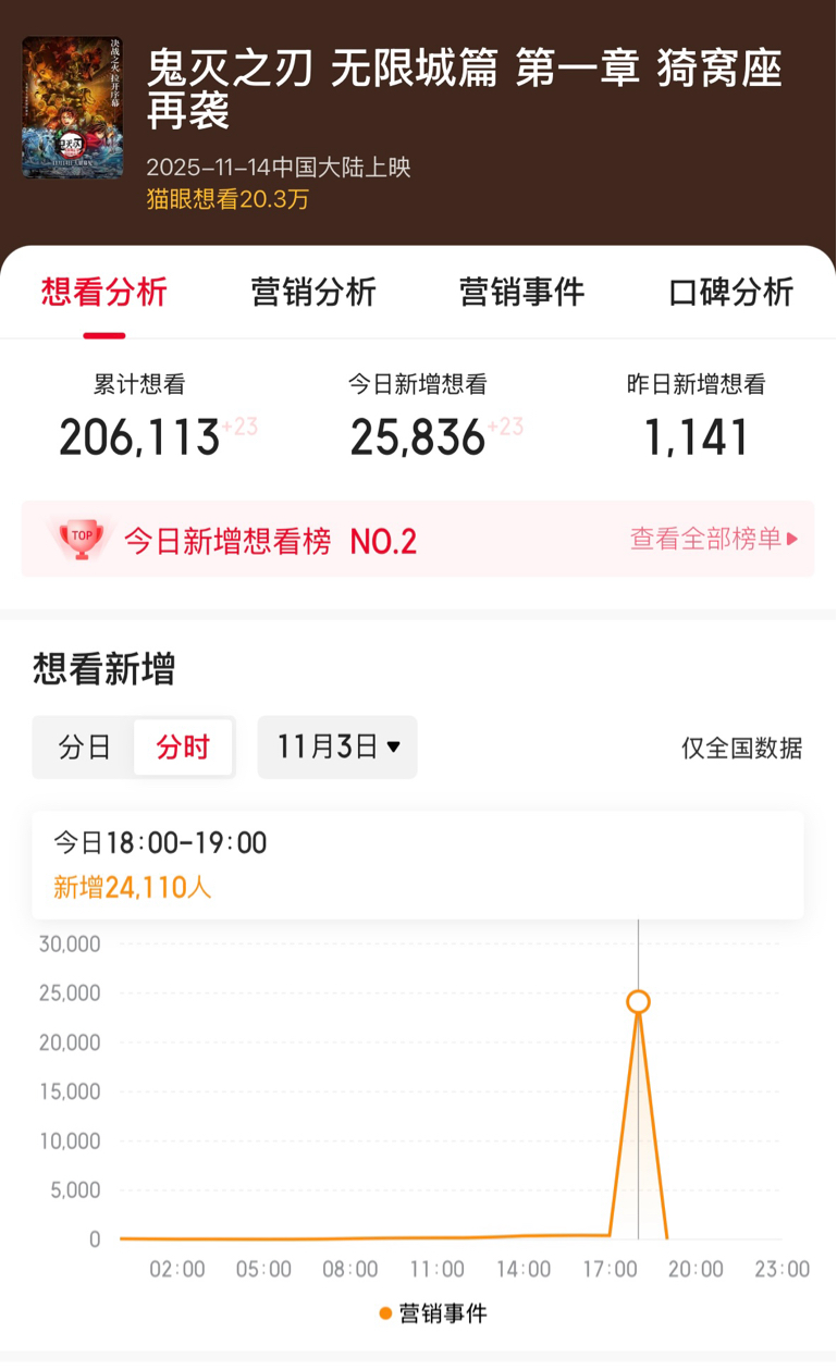$中国电影(SH600977)$ 鬼灭之刃 18点宣布定档 18-19点 单个小时想看人数增加 24110人....明天高开高走了