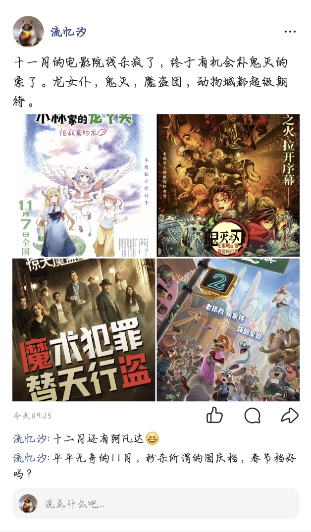 $中国电影(SH600977)$ 还在犹豫什么,孩子们,这十一月电影院必然大卖啊,秒杀国庆档春节档