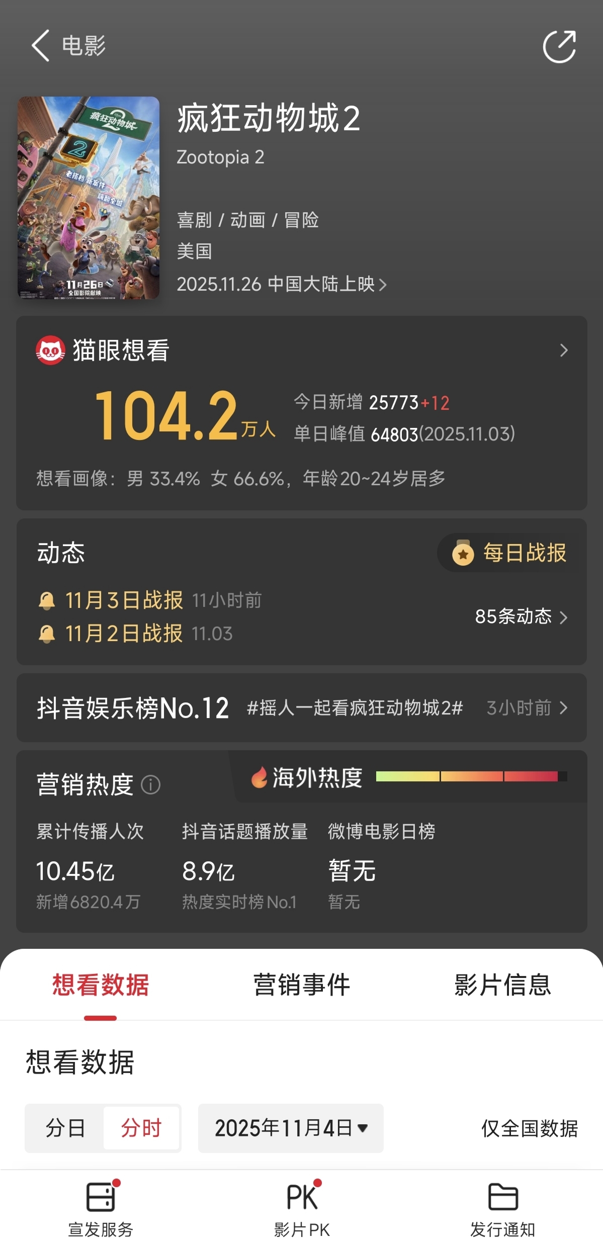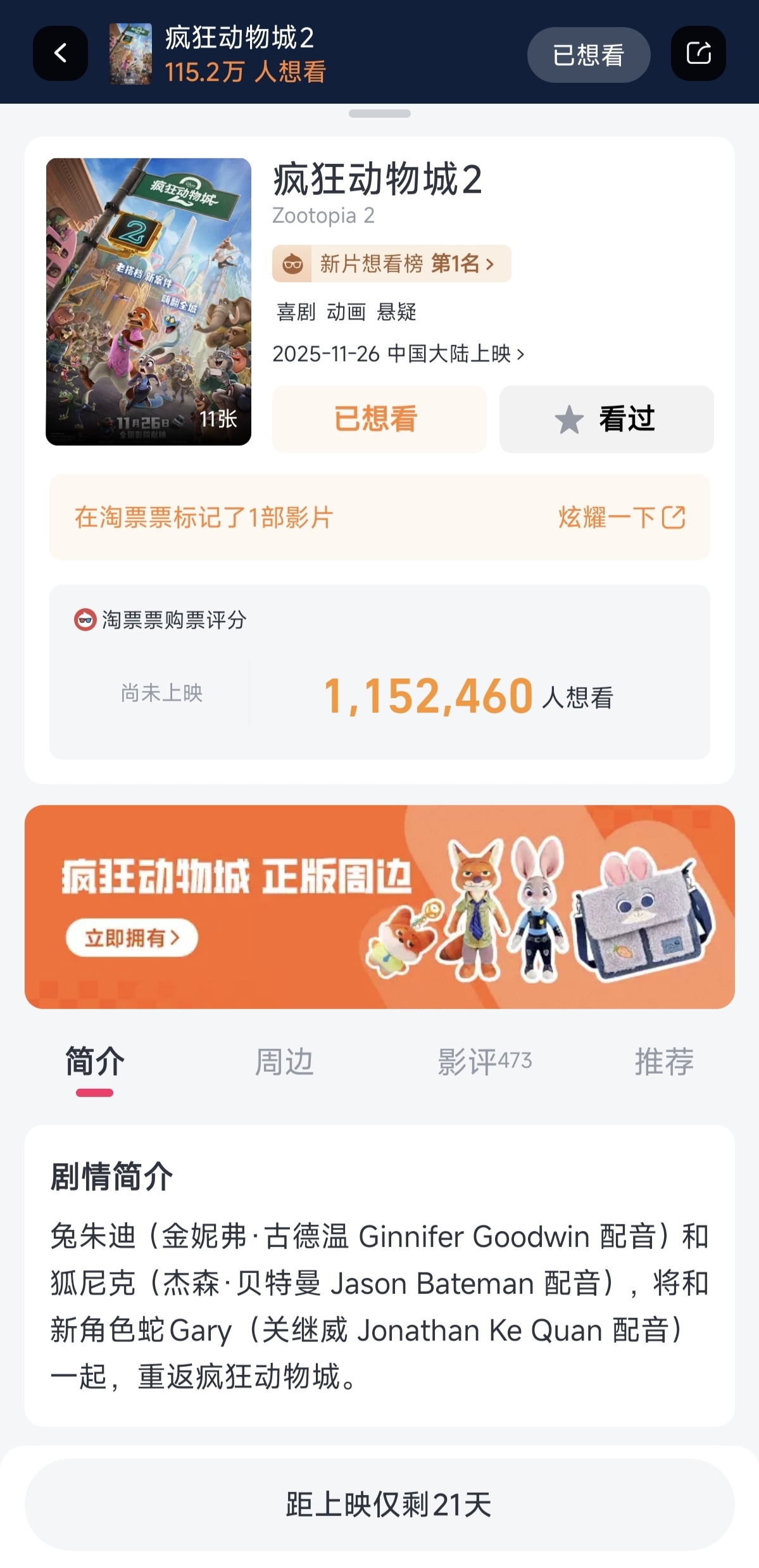 《疯狂动物城2》想看人数多平台突破100W!距离上映还有21天!会是第二个《哪吒