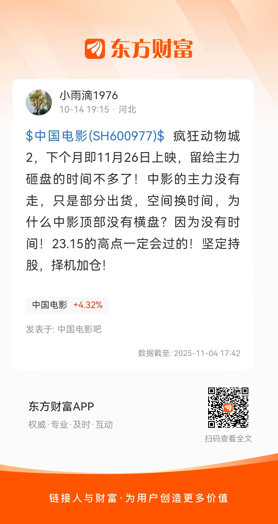 $中国电影(SH600977)$ 疯狂动物城2,下个月即11月26日上映,留给主力砸盘的时间不多了!中影的主力没有走,只是部分出货,空间换时间,为什么中影顶部没有横盘?因为没有时间!23.15的高点一定会过的!坚定持股,择机加仓!