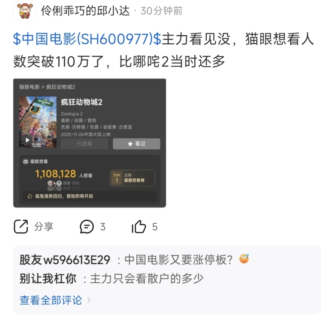 $中国电影(SH600977)$ 今天上涨主要你们要感谢我,早上发