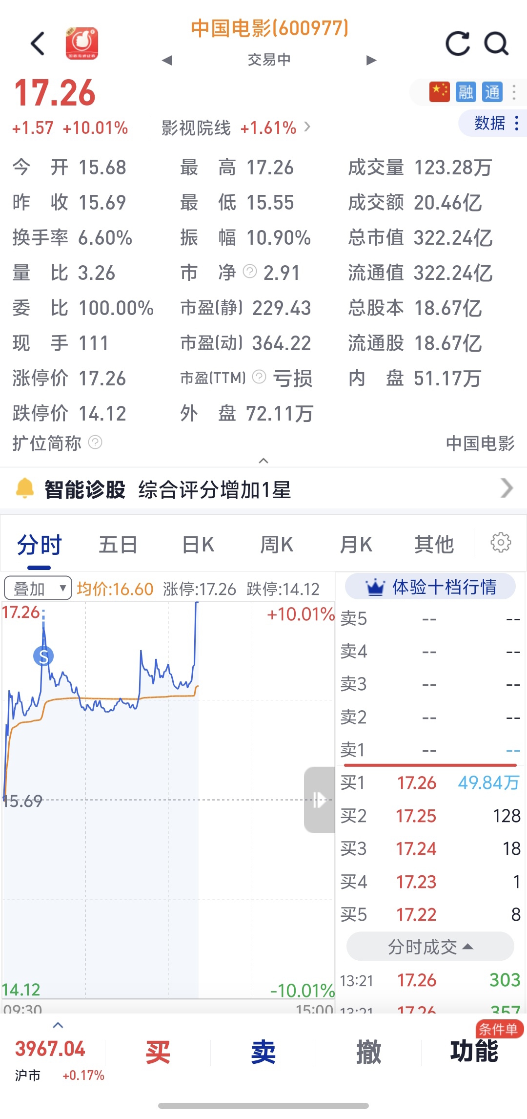 $中国电影(SH600977)$ 早上17.2卖了没接回