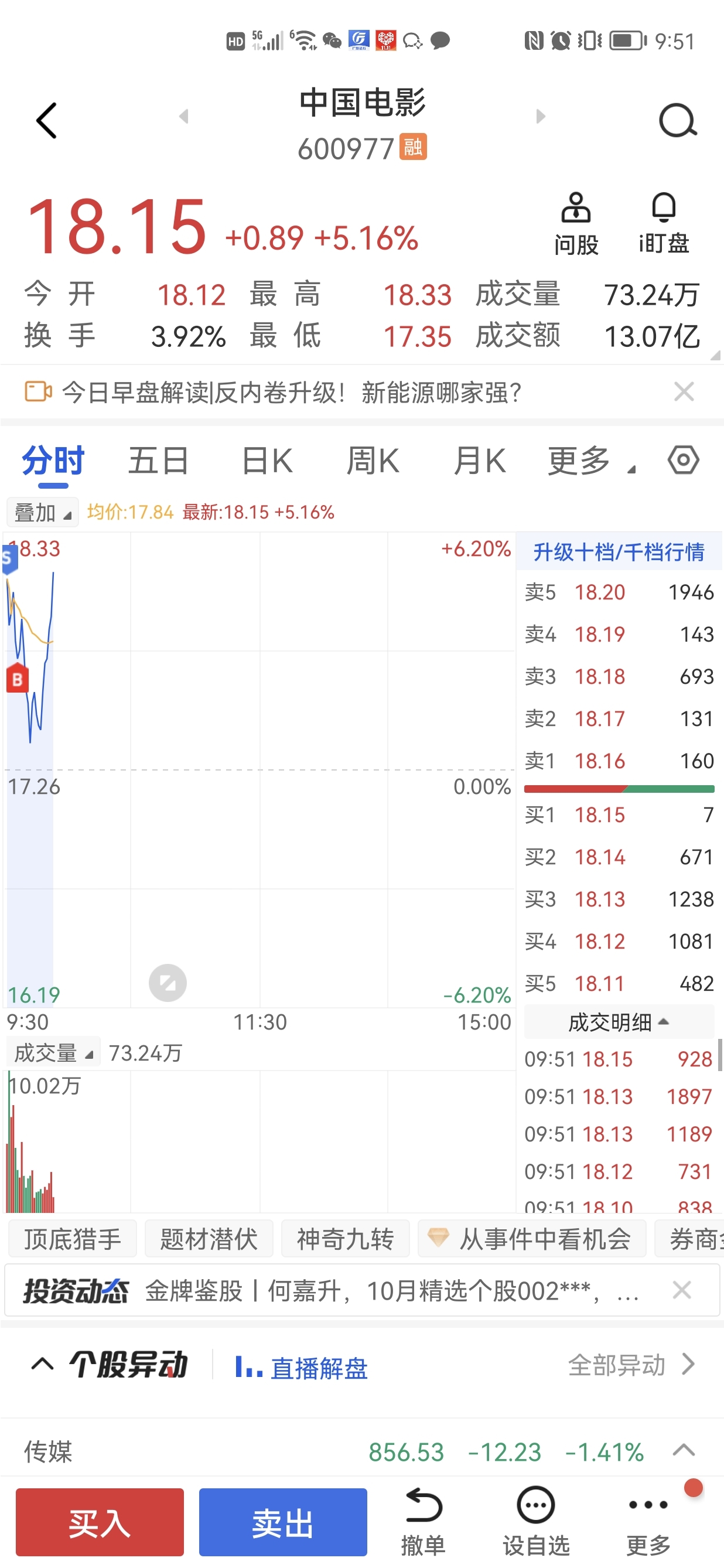 $中国电影(SH600977)$ 做了个T,今天操作结束,一股没丢!动物城不疯,我不交筹码,坚定持有!不排除有震荡,现在敢洗盘我就敢加仓!还不到出的时候!