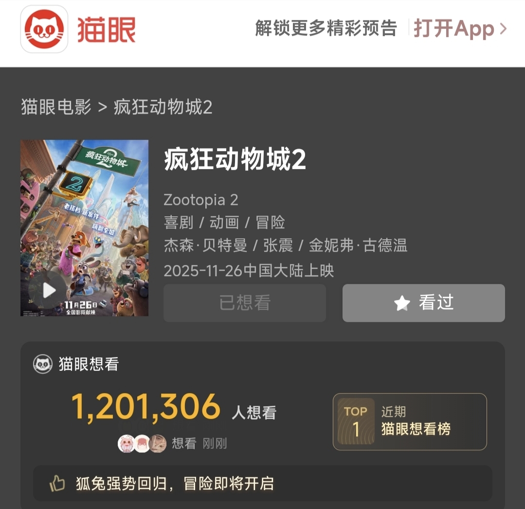 $中国电影(SH600977)$ 主力看见没。猫眼想看人数突破120万!大家继续点击呀!能转发的转发