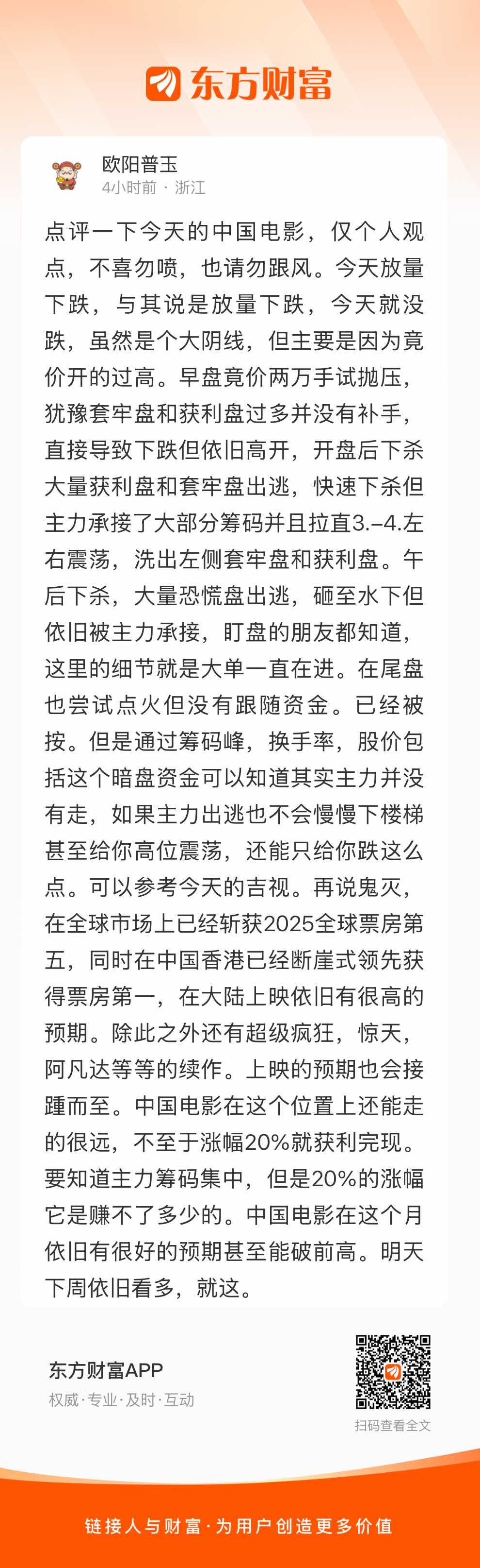 点评一下今天的中国电影,仅个人观点,不喜勿喷,也请勿跟风。今天放量下跌,与其说是放量下跌,今天就没跌,虽然是个大阴线,但主要是因为竟价开的过高。早盘竟价两万手试抛压,犹豫套牢盘和获利盘过多并没有补手,直接导致下跌但依旧高开,开盘后下杀大量获利盘和套牢盘出逃,快速下杀但主力承接了大部分筹码并且拉直3.-4.左右震荡,洗出左侧套牢盘和获利盘。午后下杀,大量恐慌盘出逃,砸至水下但依旧被主力承接,盯盘的朋友都知道,这里的细节就是大单一直在进。在尾盘也尝试点火但没有跟随资金。已经被按。但是通过筹码峰,换手率,股价包括这个暗盘资金可以知道其实主力并没有走,如果主力出逃也不会慢慢下楼梯甚至给你高位震荡,还能只给你跌这么点。可以参考今天的吉视。再说鬼灭,在全球市场上已经斩获2025全球票房第五,同时在中国香港已经断崖式领先获得票房第一,在大陆上映依旧有很高的预期。除此之外还有超级疯狂,惊天,阿凡达等等的续作。上映的预期也会接踵而至。中国电影在这个位置上还能走的很远,不至于涨幅20%就获利完现。要知道主力筹码集中,但是20%的涨幅它是赚不了多少的。中国电影在这个月依旧有很好的预期甚至能破前高。明天下周依旧看多,就这。