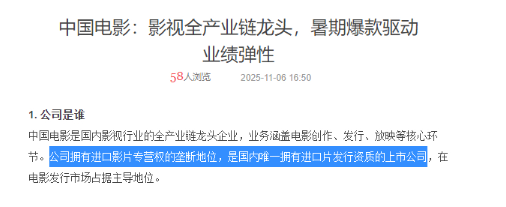 $中国电影(SH600977)$   今天的盘后新闻。识字的朋友,可以放心了。  中国电影:垄断唯一!   进口影视垄断地位!国内唯一拥有进口片发行资质的公司