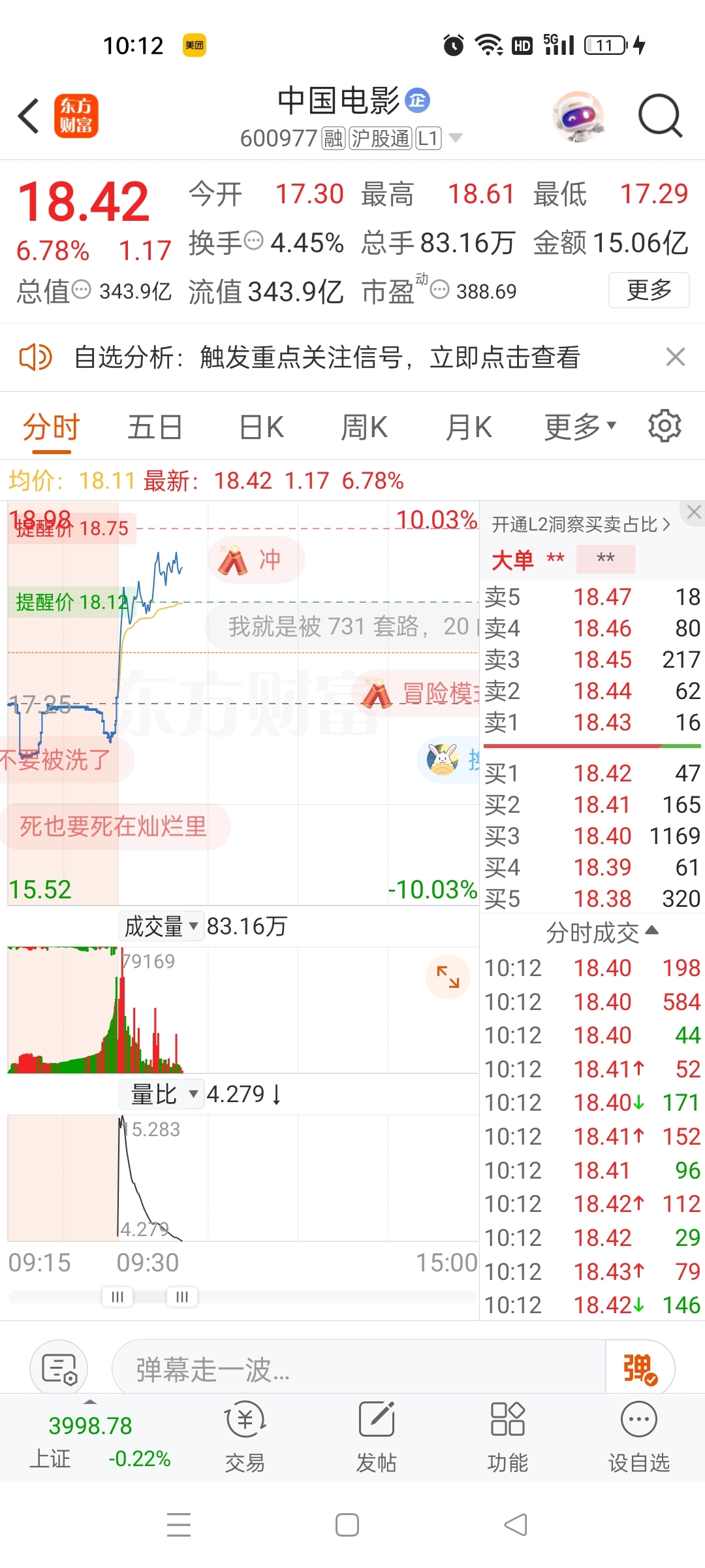 $中国电影(SH600977)$ 10月28号选出来潜伏的票,昨天6成仓进来的,上涨趋势建平台,看好这个月再翻倍