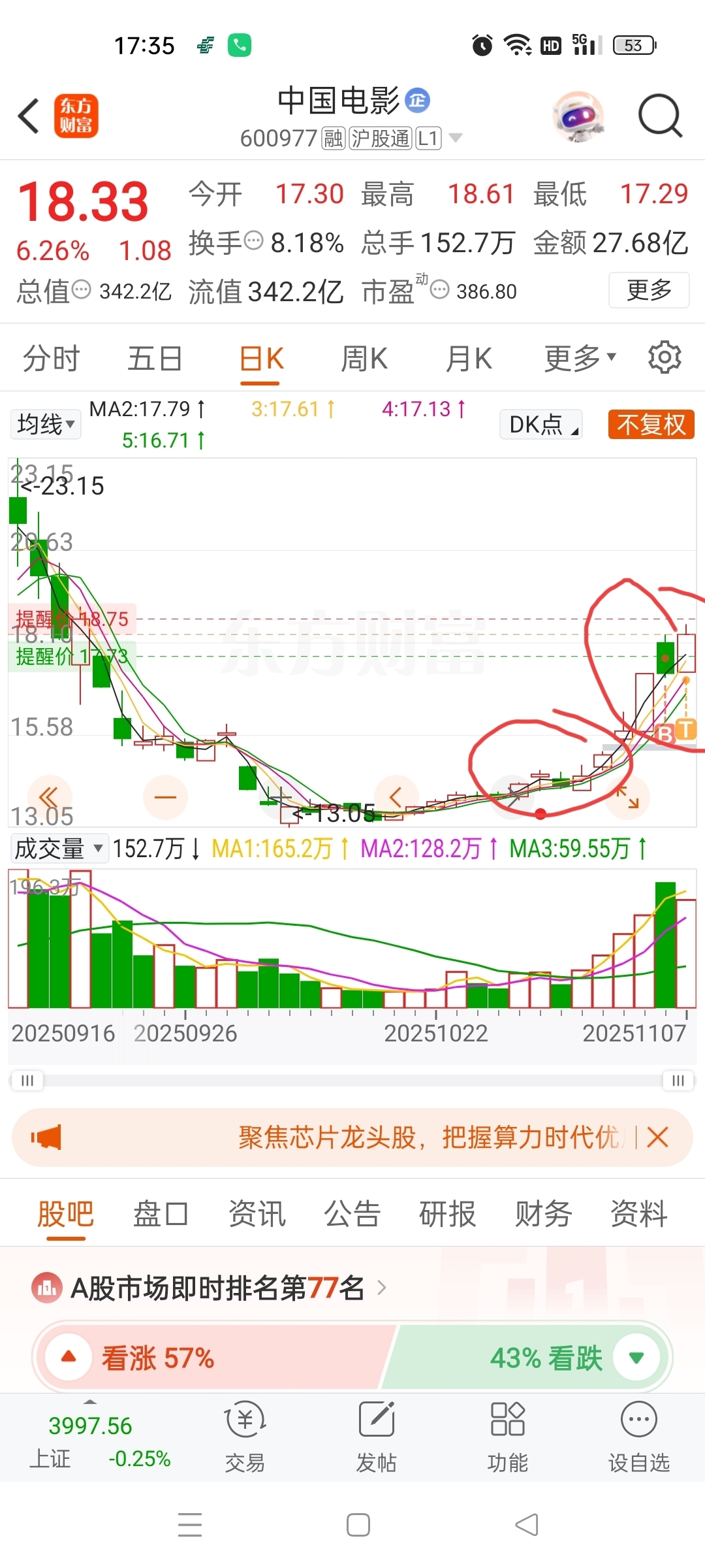 $中国电影(SH600977)$ 主力下面一圈吸筹,中间一个洗获利盘阳线,又连续三天放量吃货,不涨怎么可能,最什么还有一个主力放量阴线,闲杂资金少的很