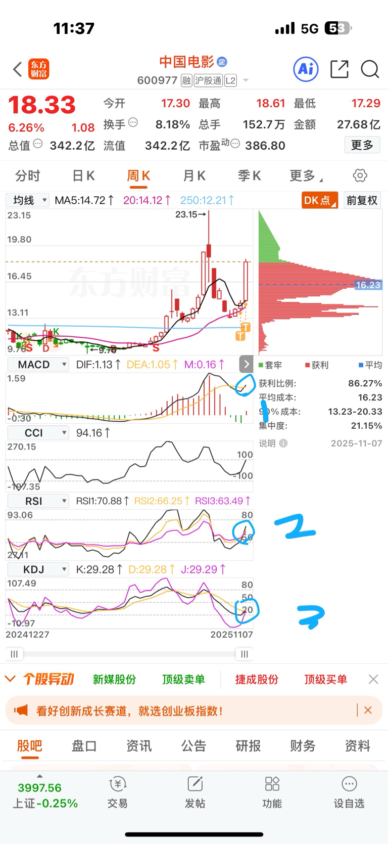 $中国电影(SH600977)$ 这周K图很顶级了,三条指标中低位同时金叉啊