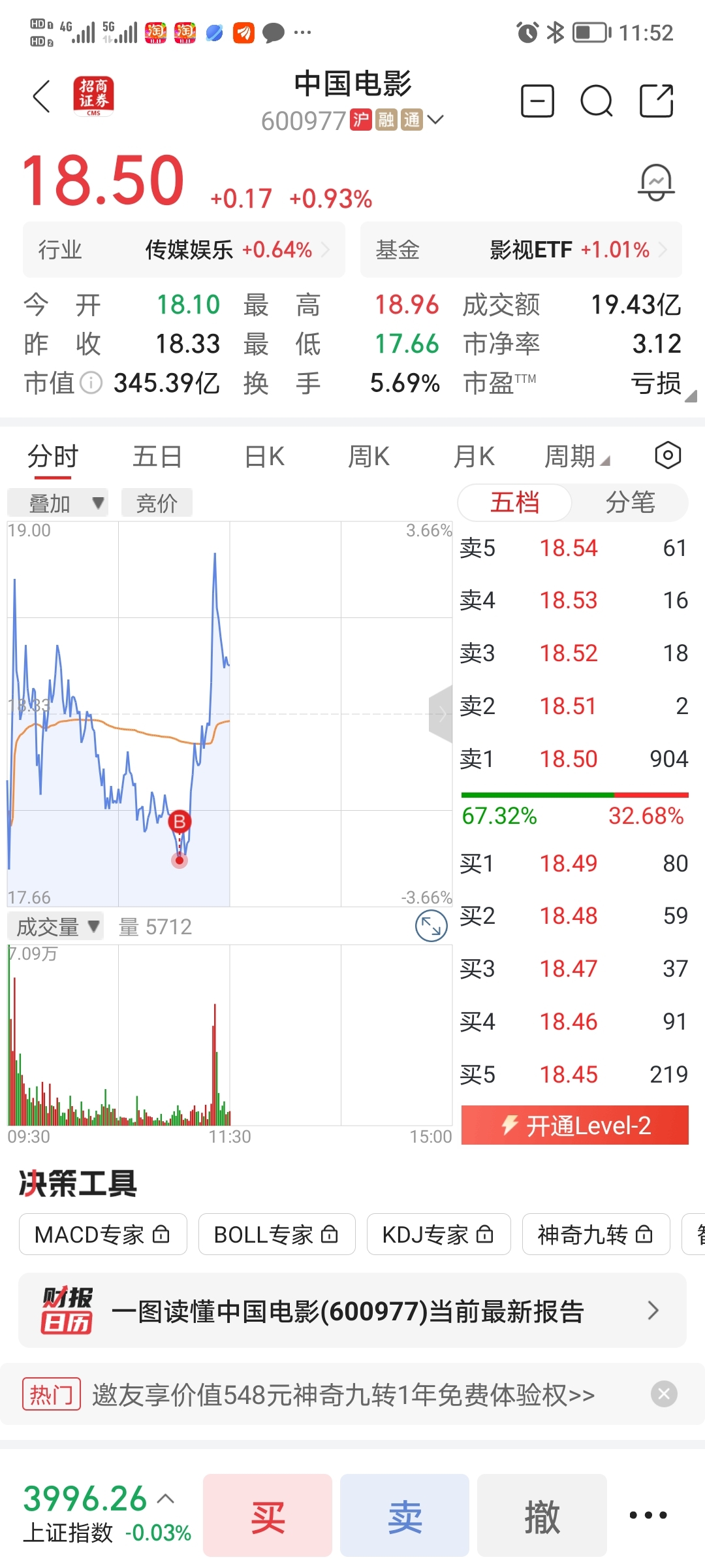 $中国电影(SH600977)$ 今天重新入场,承接这么强,被套我也认了