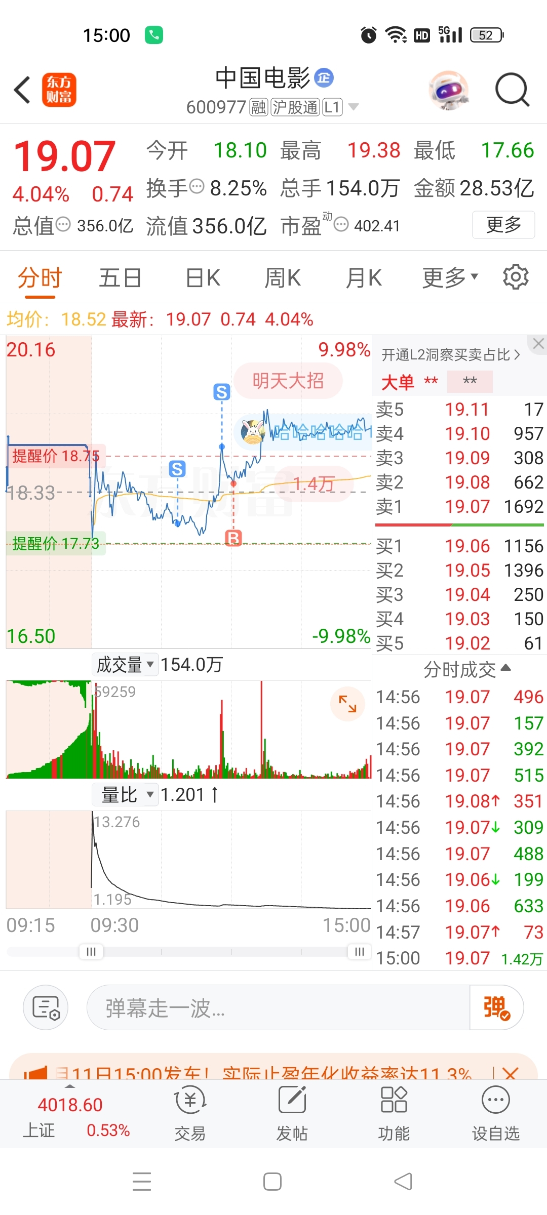 $中国电影(SH600977)$ 18.75未突破,尾盘未接力,早盘走的有一点弱破了17.73,明天准备出局,看不懂明天该怎样开盘才符合预期