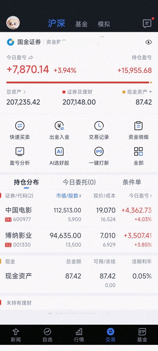 实盘打卡第一天$中国电影(SH600977)$ $博纳影业(SZ001330)$
