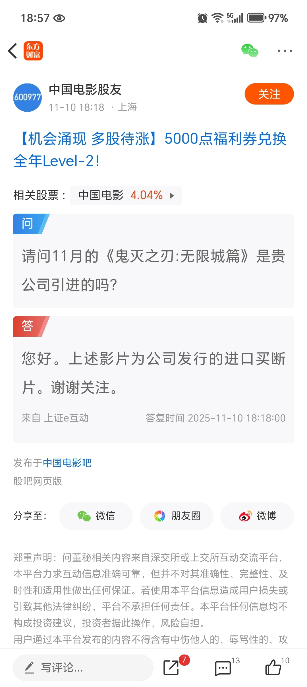 $中国电影(SH600977)$ $猫眼娱乐(HK|01896)$ 从董秘这么含糊其辞的回答来看,公司就是想炒股价了,猫眼买的片子只字不提,玩文字游戏,猫眼7000万感觉打水漂了