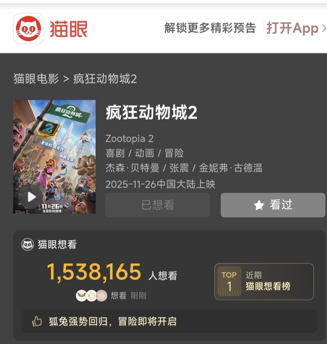 $中国电影(SH600977)$ 大家继续买进,猫眼马上160万大家继续点击呀!能转猫眼转发,拜托