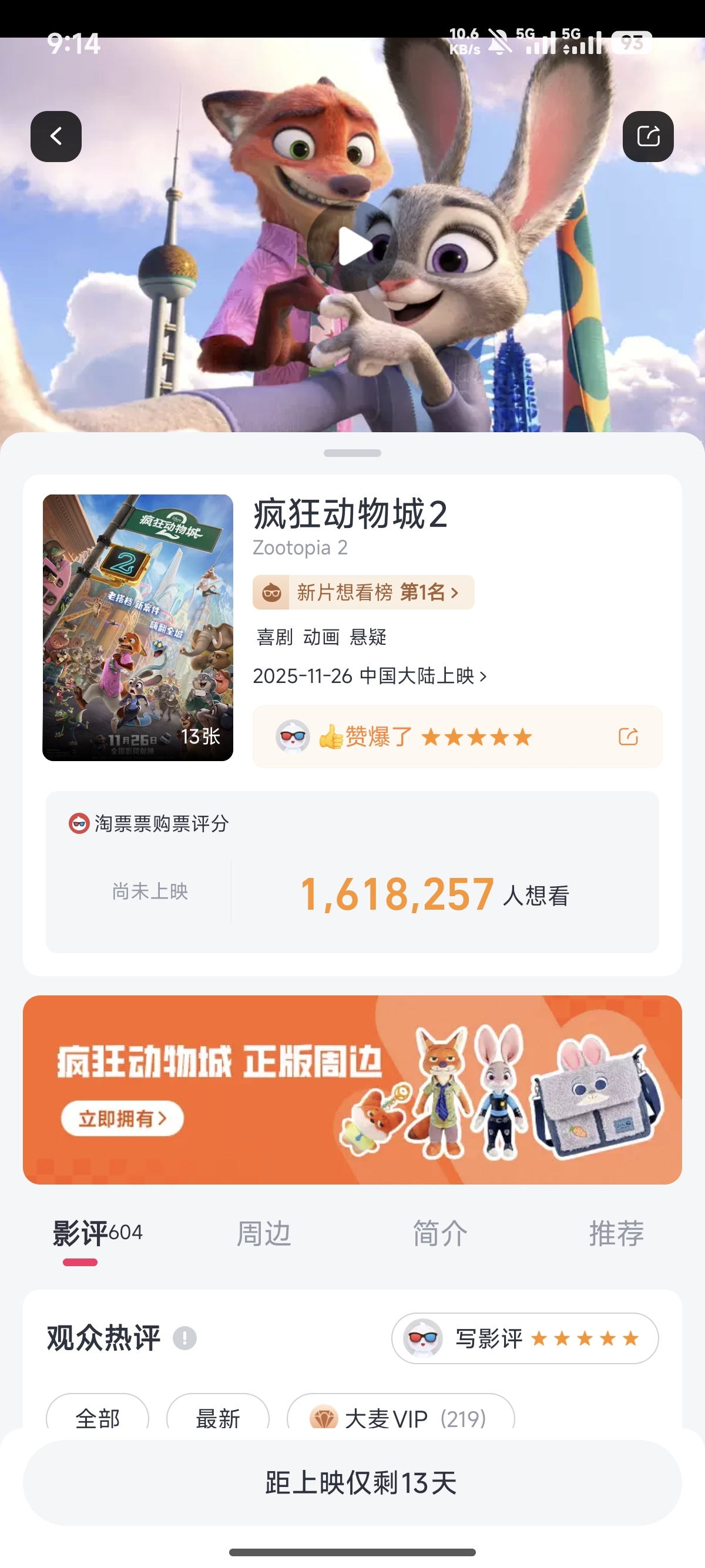 《疯狂动物城2》距离上映还有13天!多平台想看人数突破150万!中国电影引进发行