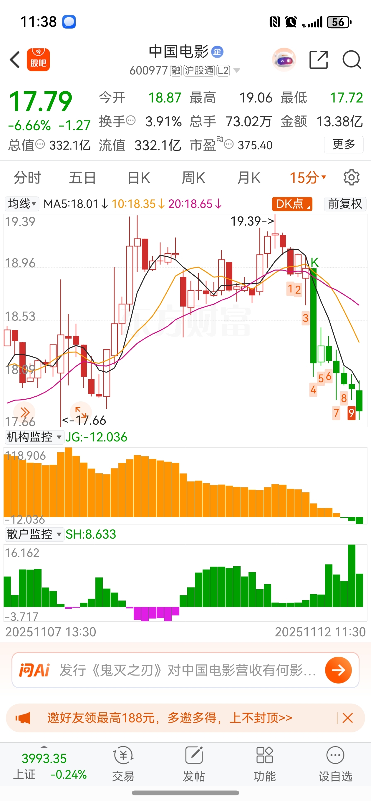 $中国电影(SH600977)$ 主力陆续退出,散户加仓了