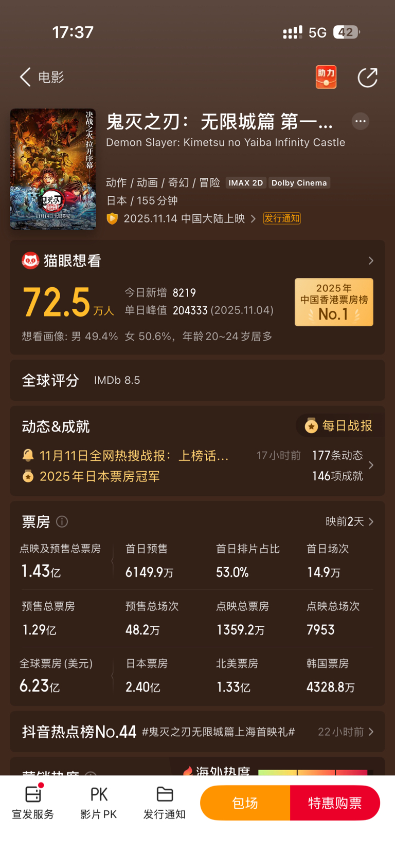 后天周五11.14号上映,目前票房1.43亿,周五周六周日排片百分之80以上,周