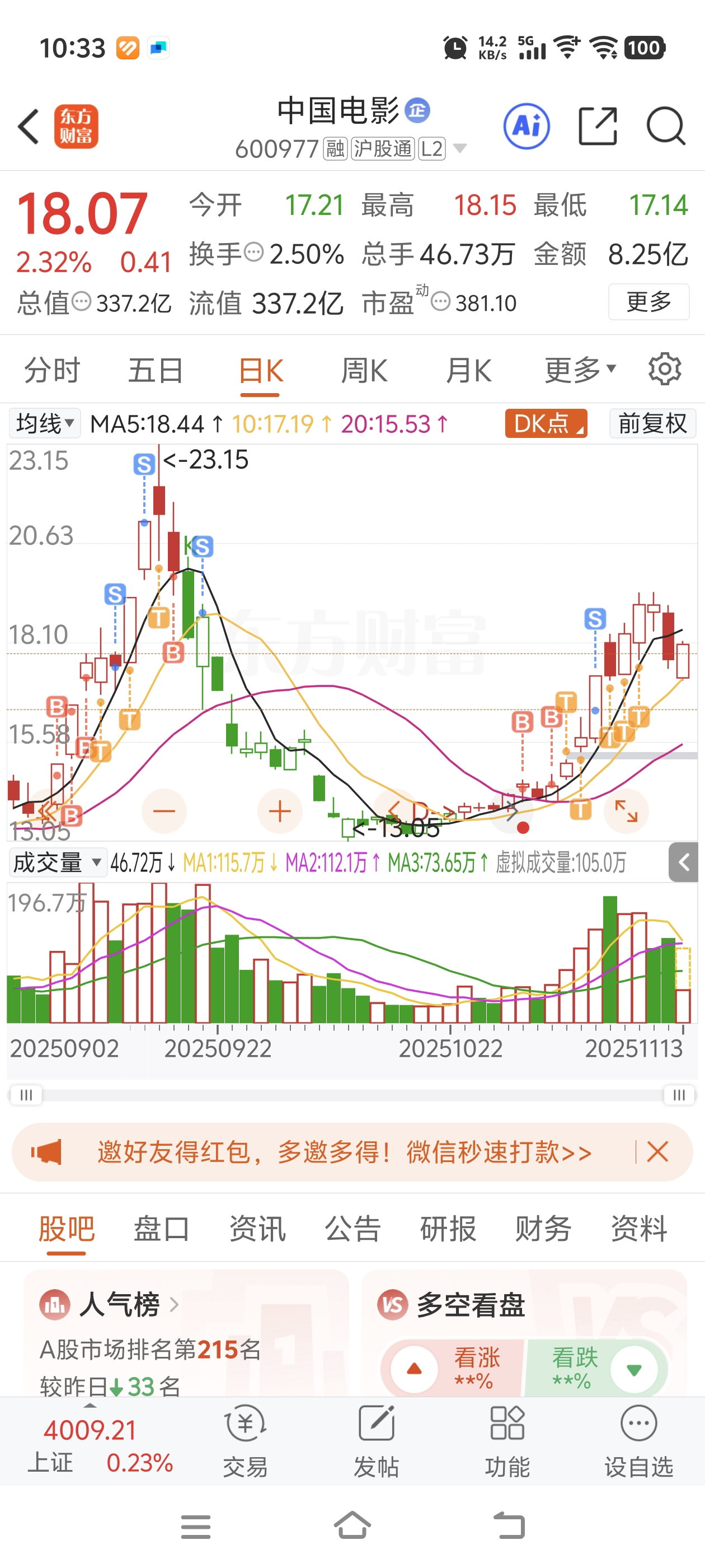 $中国电影(SH600977)$ 持股不动,11月20号北京首映疯狂2,可能下周一左右开预售,年前看到30以上,拿稳扶好