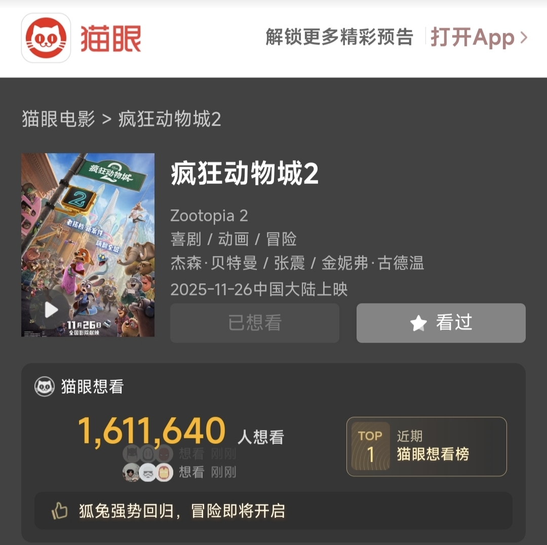 $中国电影(SH600977)$ 大家继续点击呀!破160万了,这周让它破170万,能转发猫眼转发