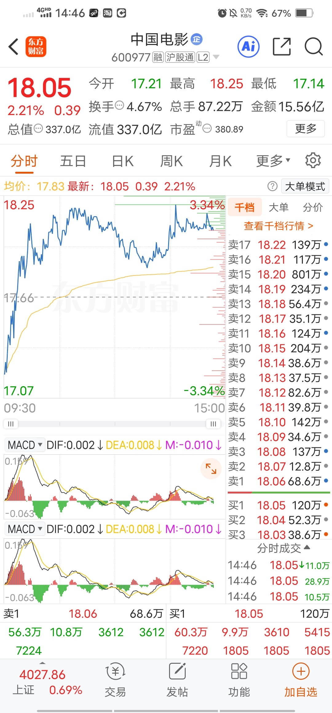 $中国电影(SH600977)$ 18.20的800万的老哥是想干什么??我们