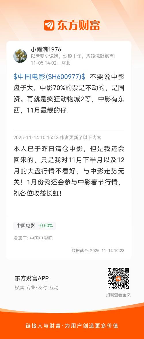$中国电影(SH600977)$ 不要说中影盘子大,中影70%的票是不动的,是国资。再就是疯狂动物城2等,中影有东西,11月最靓的仔!