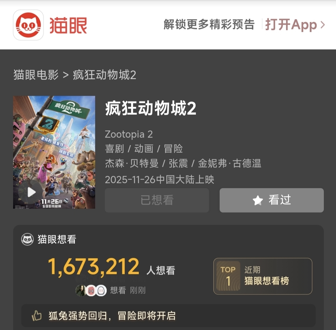$中国电影(SH600977)$ 大家继续点击呀!马上突破170万!争取上映破180万能转发猫眼转发点击
