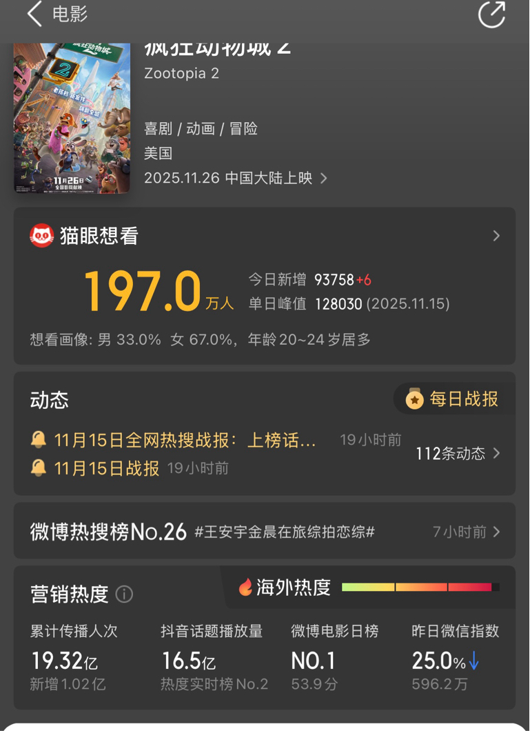 动物城想看人数超过197万..位居猫眼想看人数历史排行榜第三位...
