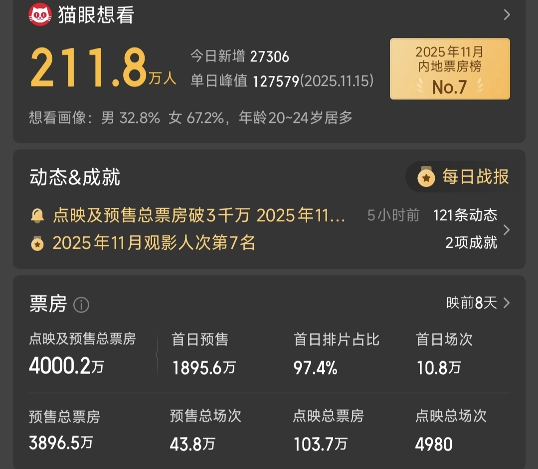 $中国电影(SH600977)$ 预售第二天,破4000万了,大家一起打败哪咤2,给你们一个一字板