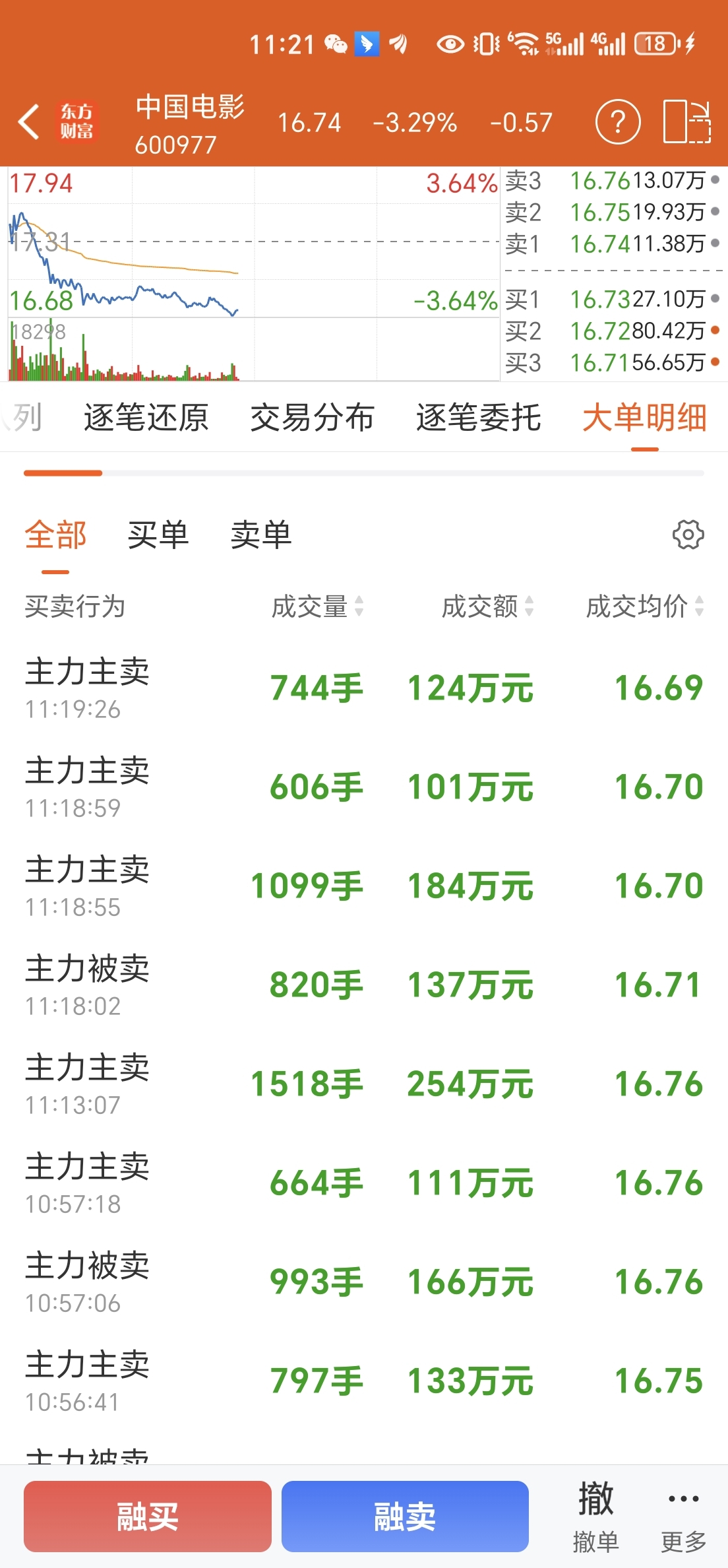 $中国电影(SH600977)$ 下面大单托住,打到大单位置,立马撤单,一直在出货!