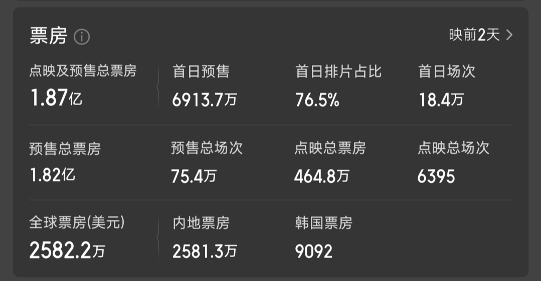 预售第八天,预售票房1.82亿今天破2亿,26号最重要是豆瓣评分和猫眼评分,英语