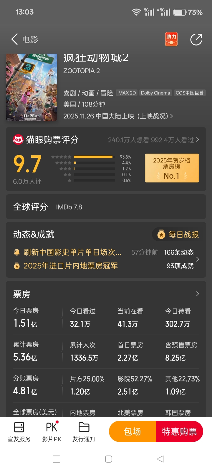 终于封板了,兄弟们,期待我们参投的(疯狂动物城2)票房能冲到8亿!周六周末,一起