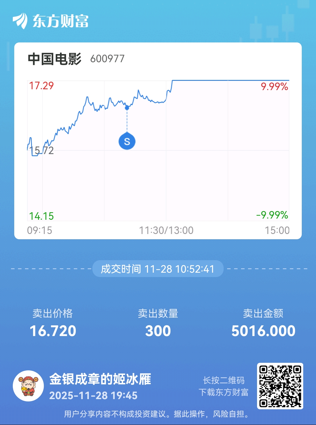 $中国电影(SH600977)$ ,兄弟们是我格局小了,前天16块1拿的廉价筹码被主力骗跑了