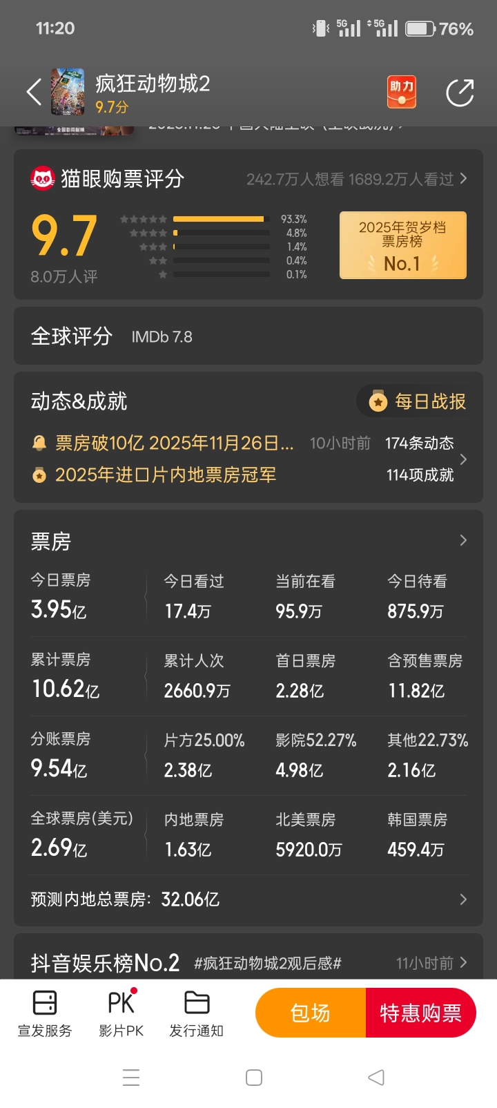 $中国电影(SH600977)$ 电影(疯狂动物城2)票房突破10亿,预测最终有30亿,预祝低成本参投的朋友,不光是古票赚钱,电影也能收获满满,盈利双收,下周继续加油冲!