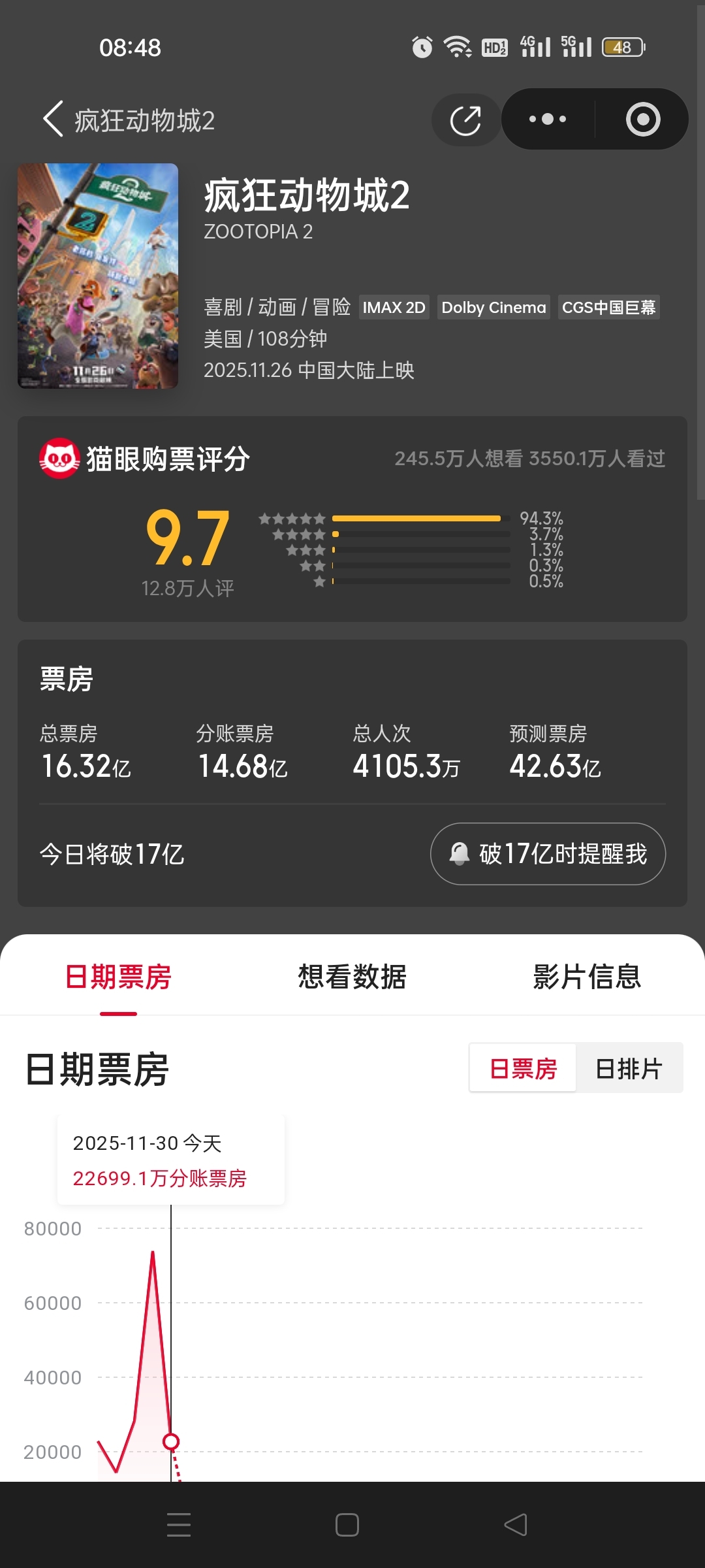 $中国电影(SH600977)$ 预测票房调整为42亿,太炸裂,错过了好可惜啊,大腿拍肿了