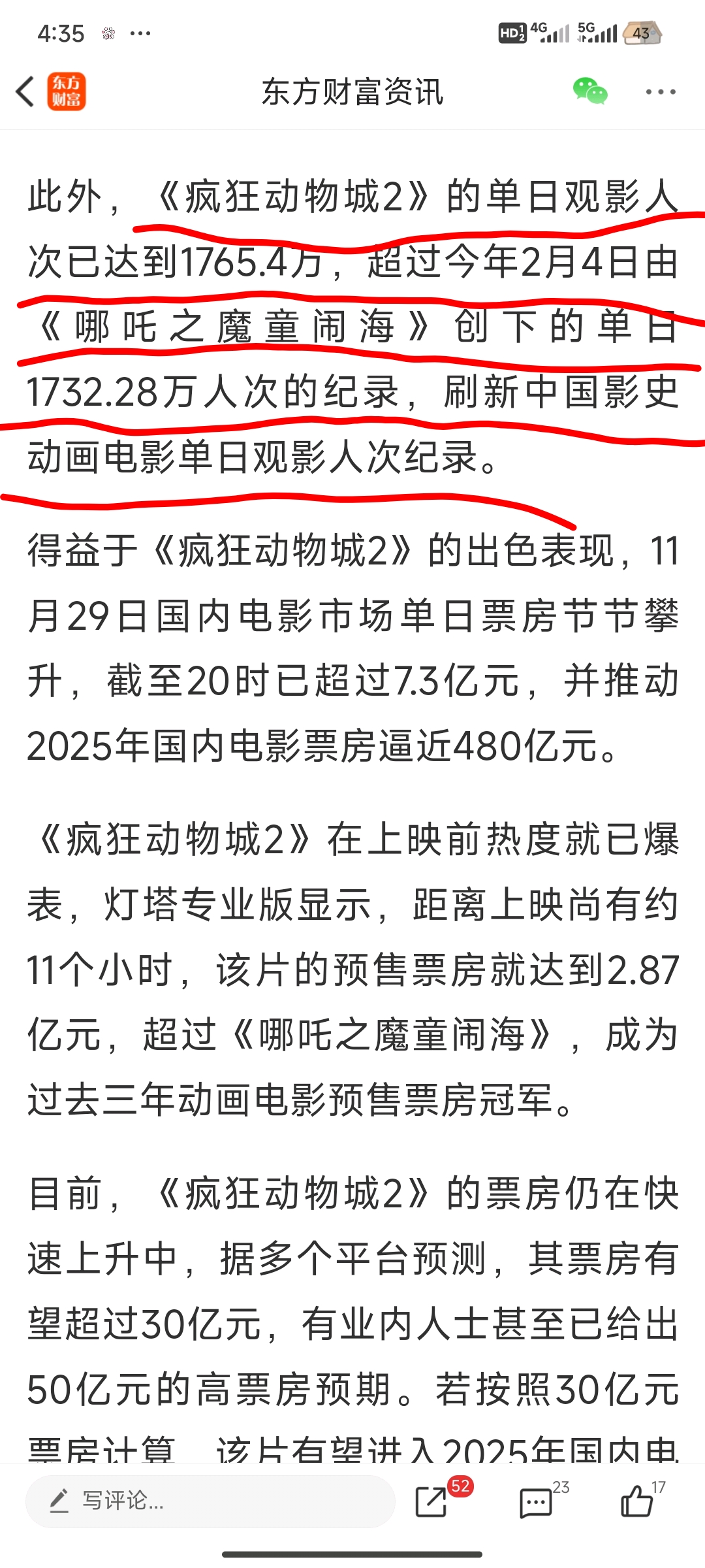$中国电影(SH600977)$ $幸福蓝海(SZ300528)$ 疯狂动物城2单日票房已经超越哪吒了,现在不是春节也不是假期,后市可期!