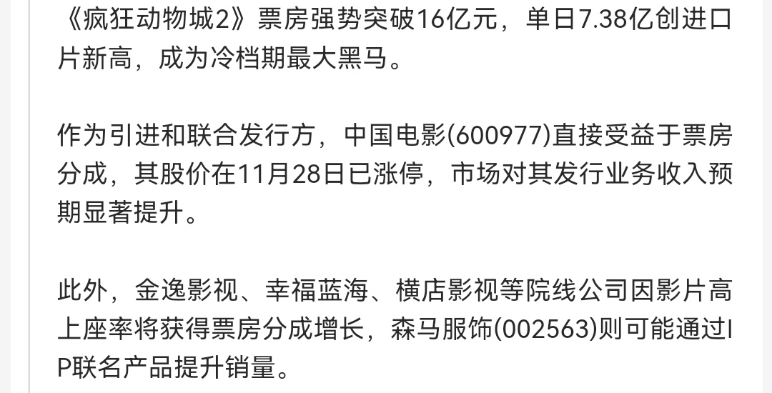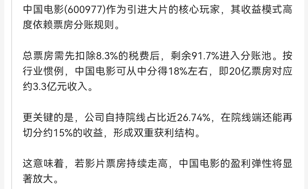 $中国电影(SH600977)$ 中国电影在发行方面可以分16.5%的票房,在院线上面可以分12.8%的票房,从华夏电影可以分得2.3%的票房,所以说中国电影大概能分得总票31.6%,是光线传媒没办法比的。因为光线传媒不能从其他公司分的票房,尤其是电影院这一块蛮大一个。