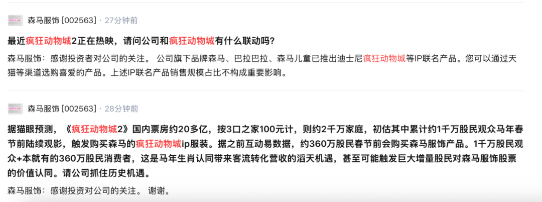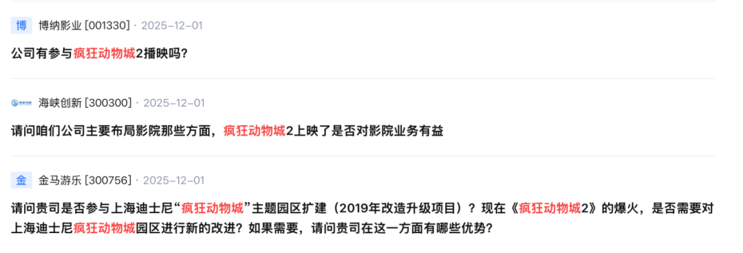 《疯狂动物城2》持续火热,不少投资者也在投资平台询问相关上市公司的布局情况。