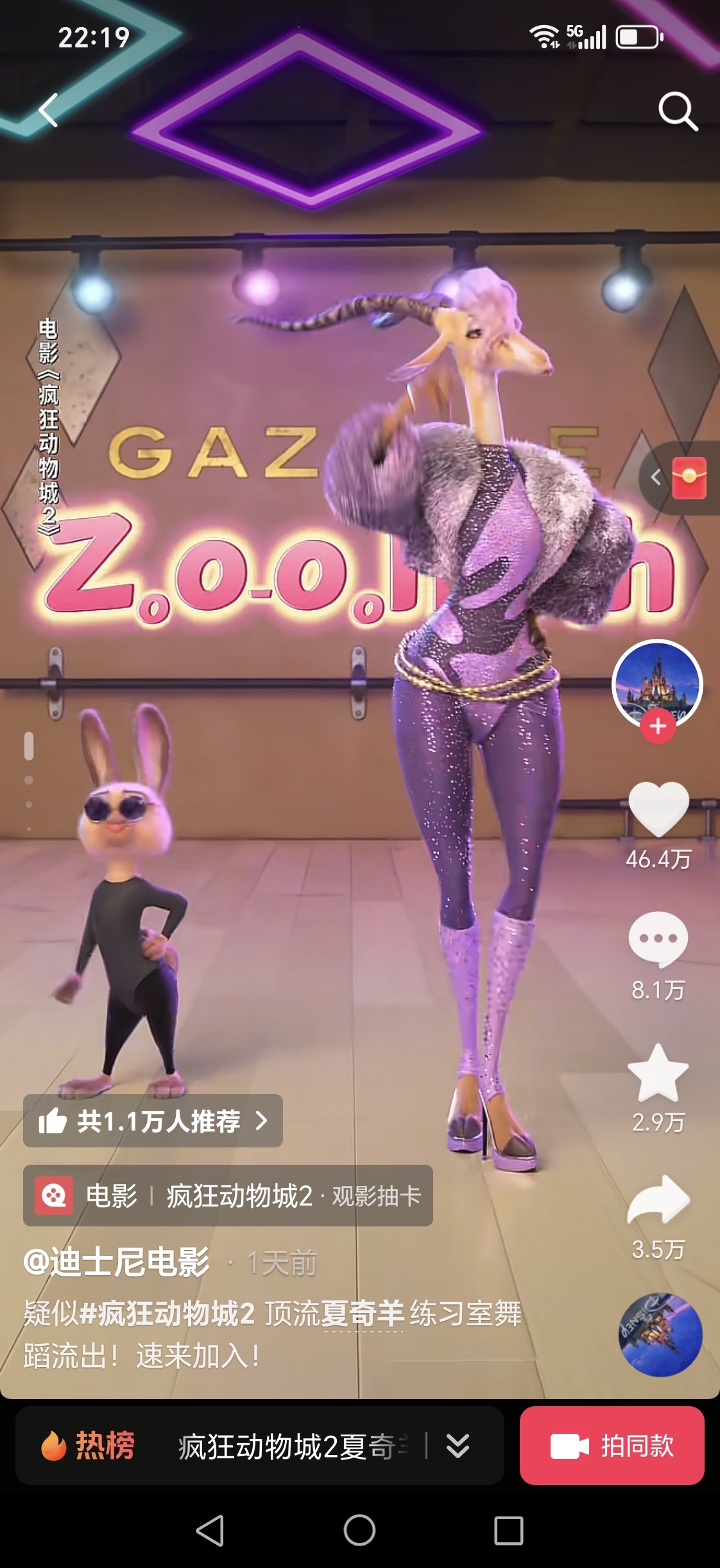 $中国电影(SH600977)$ 今天疯狂动物城上抖音热搜竟然是一段舞蹈模仿挑战
