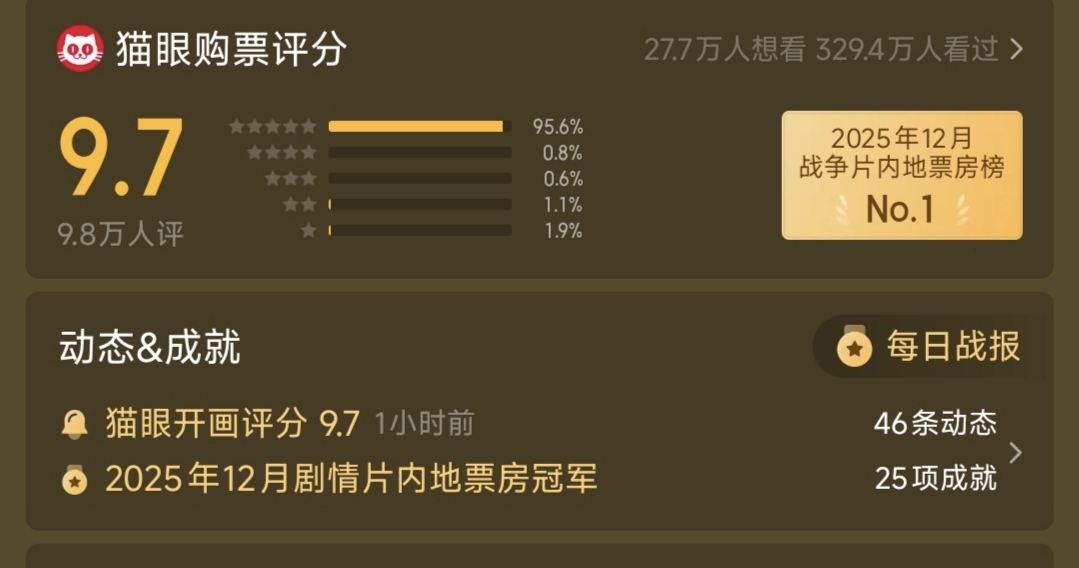 $中国电影(SH600977)$ 得闲谨制猫眼开画评分出来9.7