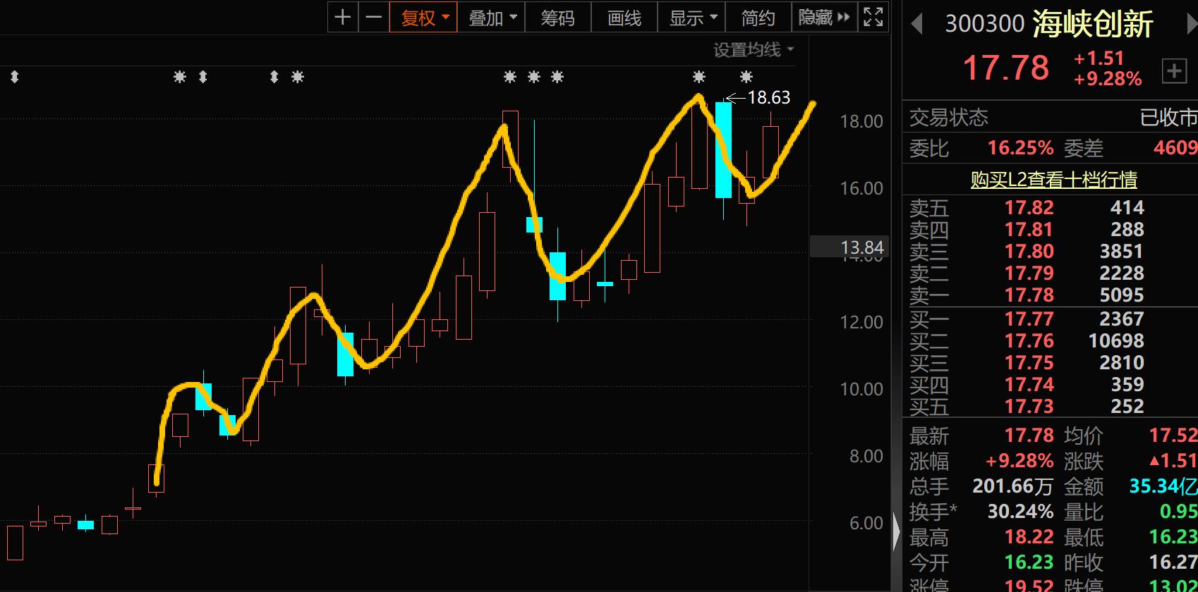 海峡创新今天的操作思路就是在5日线上持股,大涨突破5日线可以兑现。