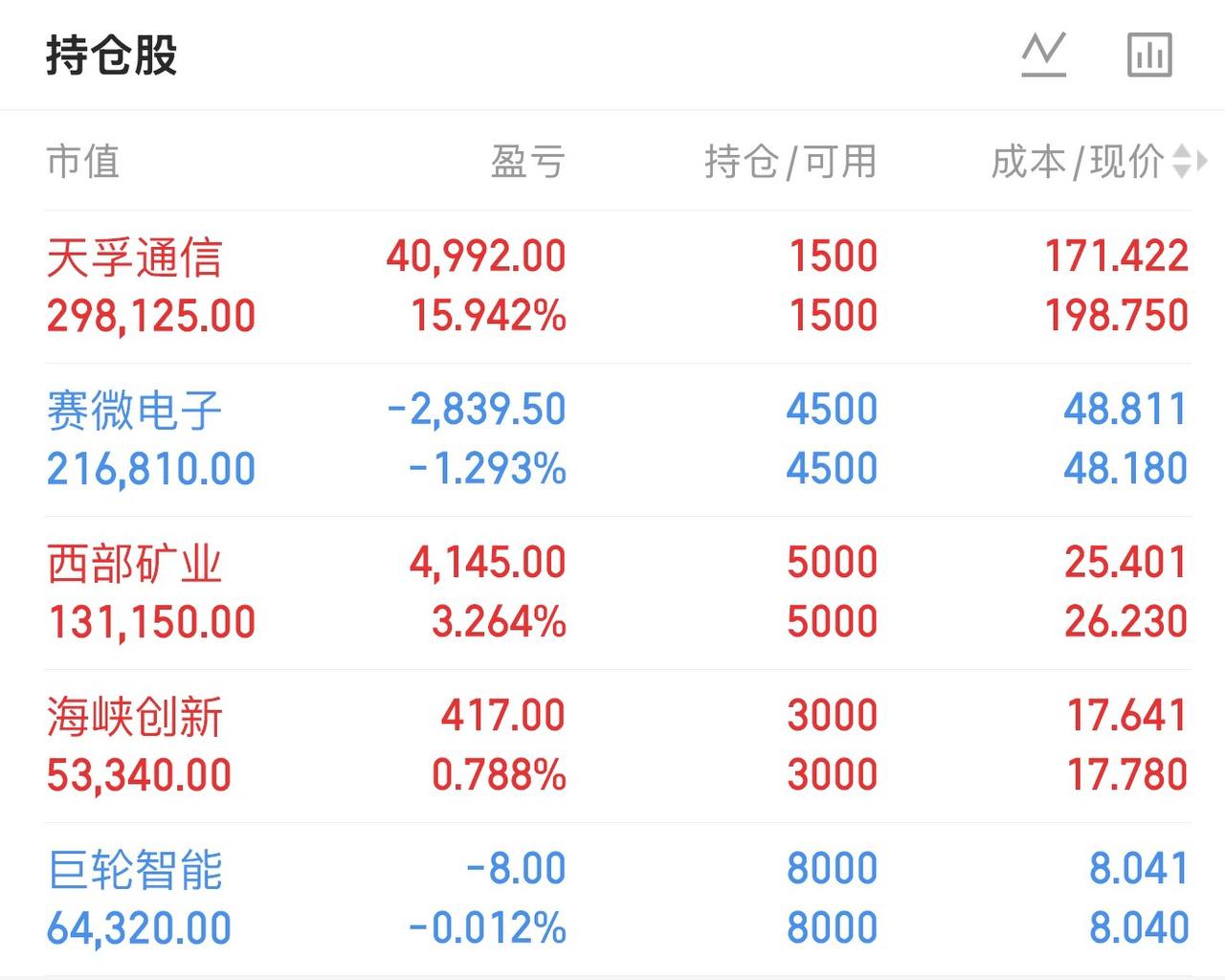 炎哥持股是做趋势票,比如天孚通信、西部矿业,还有之前做的多氟多、盛新锂能,但是对于海峡创新这种热度票,不是不可以做,这种震荡向上的票,资金做多意愿强烈,为什么拒绝呢?对于高位的合富中国、平潭发展也都是这样,小仓位博弈是没问题,但是不能去压大仓位,因为这个位置是存量先手的博弈。